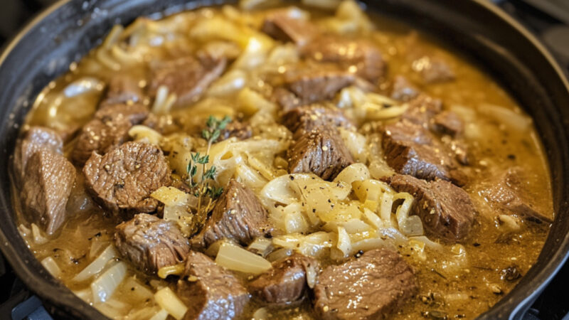 White wine and chicken stock make a delightfully different gravy for this stew that’s full of chunks of tender beef and root vegetables.