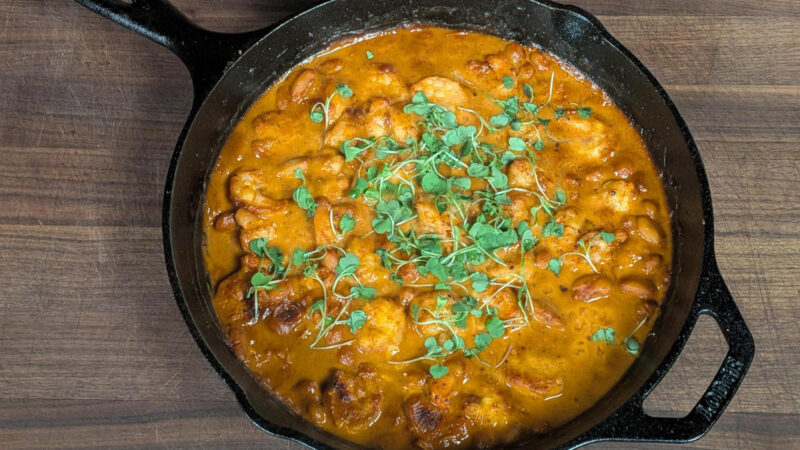 - Add the shrimp and stir to coat in the sauce, then spread in an even layer. Transfer the skillet to the broiler and broil for 2 to 4 minutes, until the shrimp are cooked through and the sauce is bubbling. Garnish with microgreens.