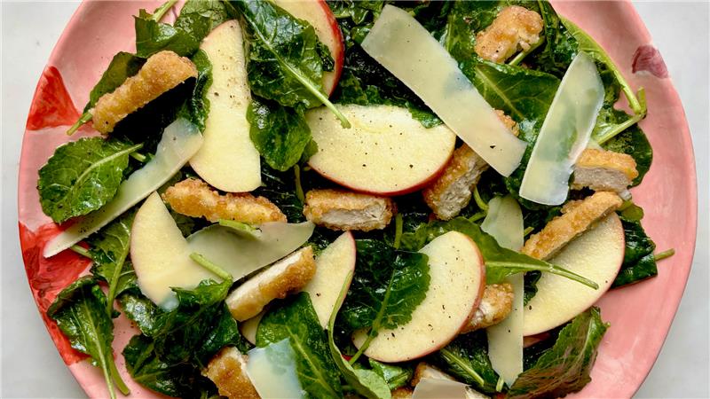 - To serve, top the salad with sliced chicken nuggets and sprinkle with shaved parmesan.