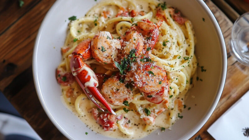 Rich and indulgent, this creamy carbonara gets an upgrade with succulent lobster meat. The combination of silky pasta, smoky pancetta, and fresh seafood makes for a luxurious holiday dish.