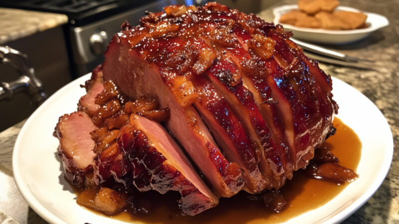 - Remove the ham from the oven, baste a final time, place on a platter and serve.