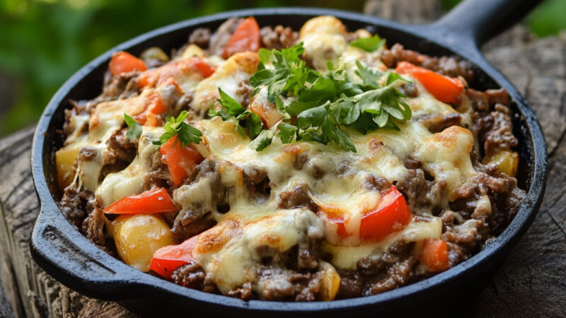 Though a traditional cheesesteak sandwich is perfect as is, we decided to take a bit of license with it. We started with thinly sliced ribeye, added mushrooms along with the onions and peppers, and topped it off with shredded provolone. This one-skillet meal is so hearty and satisfying, we doubt you’ll miss the bread (though you certainly can pile the mix onto a roll, if you like).