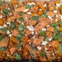 - Add the marinated chicken to the sheet pan in an even layer. Return to the oven for 6 to 9 minutes, until chicken is cooked through. Sprinkle with feta and cilantro just before serving.
