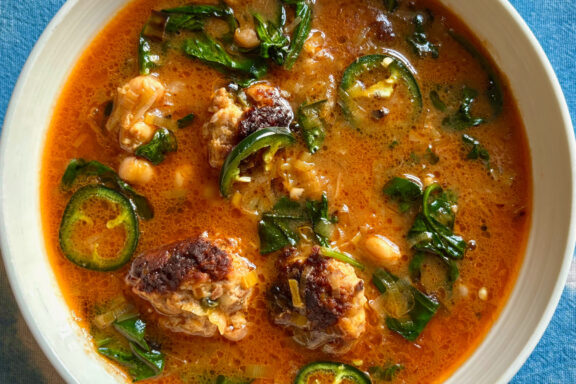Meatballs and Chickpeas in Leek-Coconut Broth