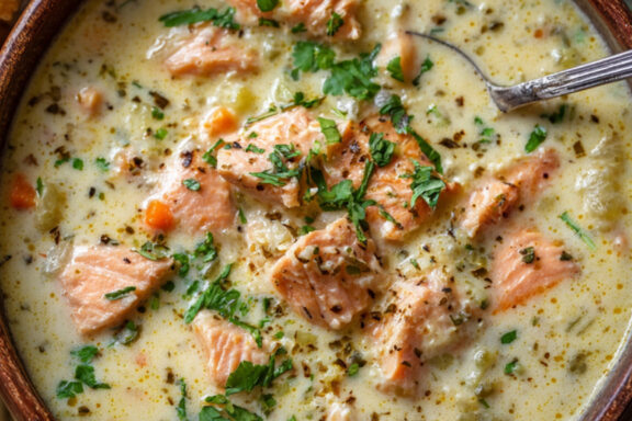 Turn up the comfort with this Creamy Salmon Chowder! Tender salmon, hearty potatoes, and sweet carrots simmer together in a velvety, herb-scented broth, finished with a swirl of cream and a squeeze of lemon for brightness. Topped with fresh dill and perfect with crusty bread, it’s cozy, nourishing, and brimming…