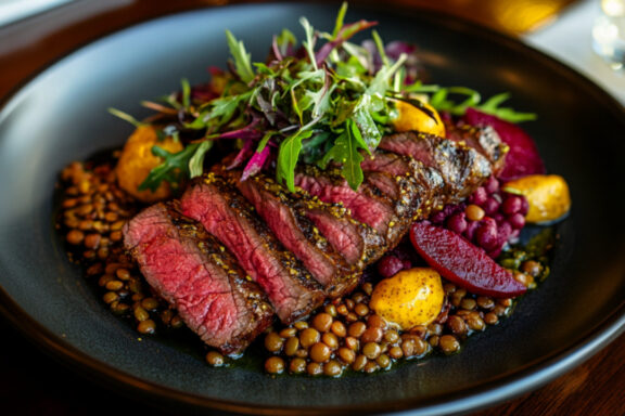 Jerk-Rubbed Top Sirloin with Mashed Plantains