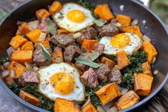 Pan-Seared Top Sirloin Steaks with Bacon and Brussels Sprout Hash