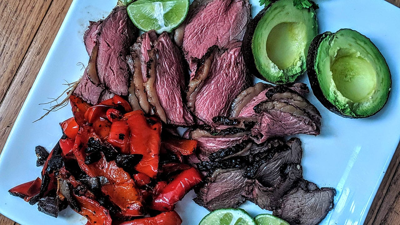 Once you’ve grilled your sirloin cap, peppers, and onions, you can fold it inside warm tortillas with fresh avocado and a spritz of lime. Amazing.