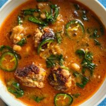 Cook the soup, covered, for 10 minutes, until flavors meld. Add the meatballs and simmer over medium for about 5 minutes, until just cooked through. Remove from the heat and stir in the spinach. Divide among bowls and garnish with jalapeño slices.